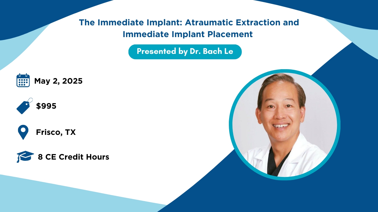 Immediate implant placement has gained popularity because it may reduce treatment time and the number of surgical interventions. A recent systematic review of the scientific evidence supports immediate implant placement as a safe procedure when certain guidelines are followed. This course will utilize lectures and hands-on exercises to address all aspects of immediate implant placement including atraumatic extraction instrumentation and techniques, immediate implants in molar sites, management of extraction sites with labial wall defects, and much more. Discussion will focus on some of the most commonly asked questions, such as: What is the best graft material for immediate implant placement in extraction sockets? What type of interim provisional restorations minimize tissue loss? What decisions should be made regarding immediate implant placement versus delayed implant placement?
