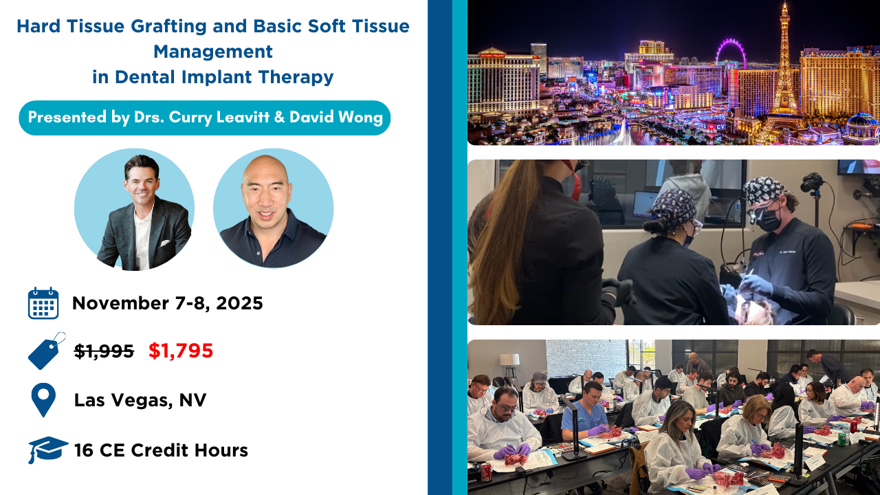 When it comes to replacing missing teeth, patients desire a predictable, long-lasting, esthetic solution. Dental implants have become the standard of care for meeting these needs, but successful implant therapy requires a solid foundation. When teeth are lost due to disease, infection or trauma, bone quality is often compromised. This course will focus on proper planning and execution of predictable bone grafting techniques to restore a patient’s smile and function with dental implants. Principles of soft tissue management around implants, including flap design, suture techniques, use of membranes and papillae maintenance, will also be presented. Participants will practice grafting techniques in a hands-on exercise utilizing pig jaws, following faculty demonstration. A live patient surgery demonstration on extraction and socket grafting will also be presented.